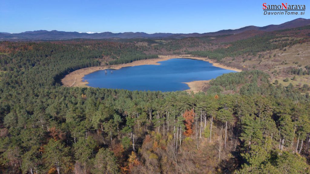 Petelinjsko jezero – presihajoče, s trenutno kar veliko vode. Daleč zadaj, na horizontu, Triglav.
