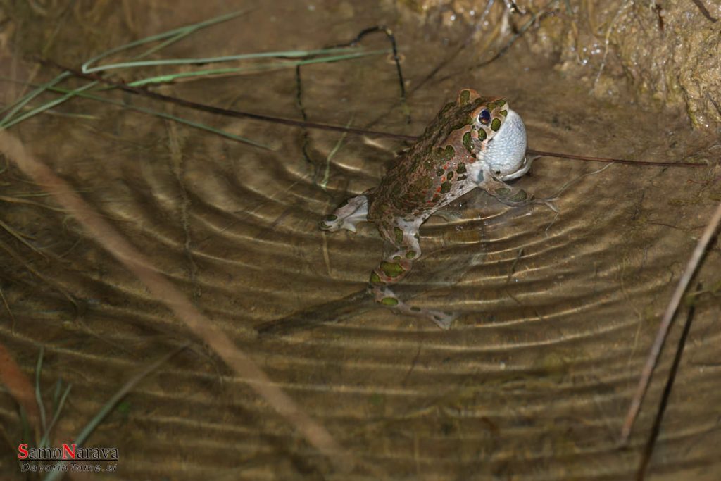 Zelena krastača – ko se oglaša na grlu napihne vrečo. Frekvenco petja bi lahko izmerili z dolžino valov, ki se pokažejo na vodi.