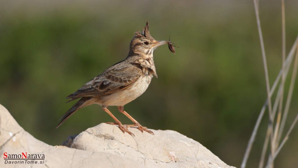 Čopasti škrjanec s poljskim kozličkom v kljunu.